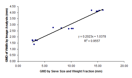 Figure 9. Comparison of switchgrass particle geometric mean dimensions (GMD) of particle width calculated using image analysis of representative samples and mass fraction from each sieve of ASABE forage standard versus GMD calculated directly using sieve opening sizes and mass fraction on ASABE forage sieves. |